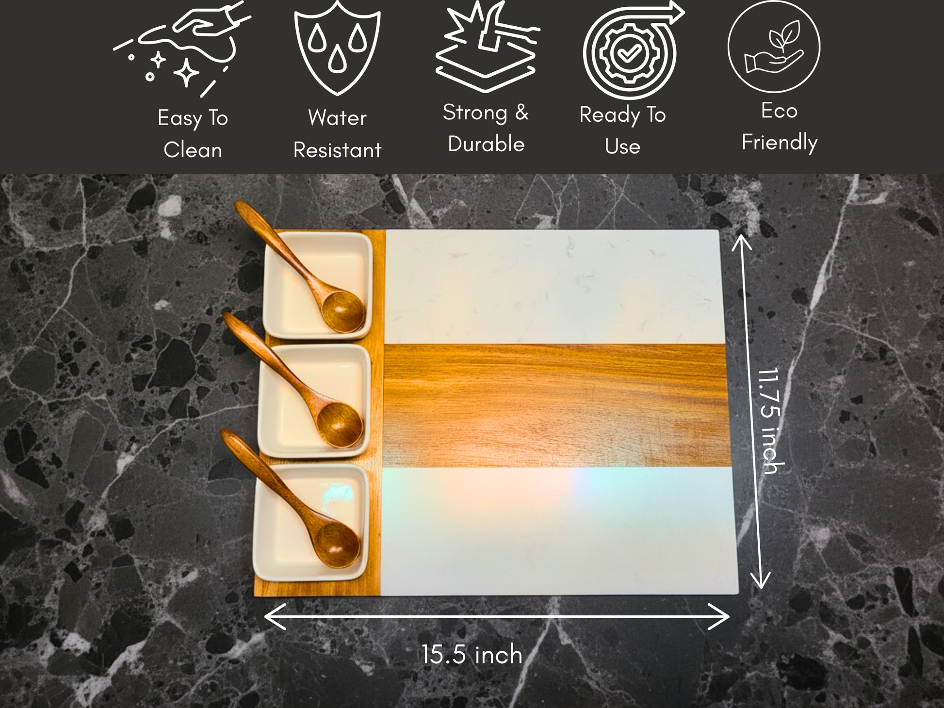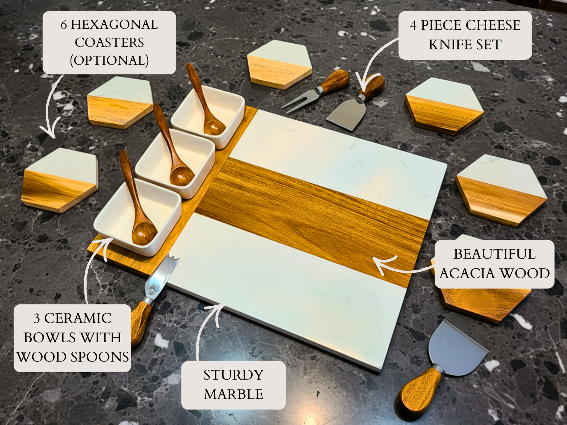 Indulge in the inherent charm of acacia wood, showcasing a range of hues, patterns, knots, and rustic elements that make each board truly unique. Discover our Elegant Marble Charcuterie Board Set โ the Ultimate 17-Piece Addition to Enhance Your Hosting Experience! This luxurious set includes all the essentials to create a spectacular spread of meats, cheeses, and hors d'oeuvres.