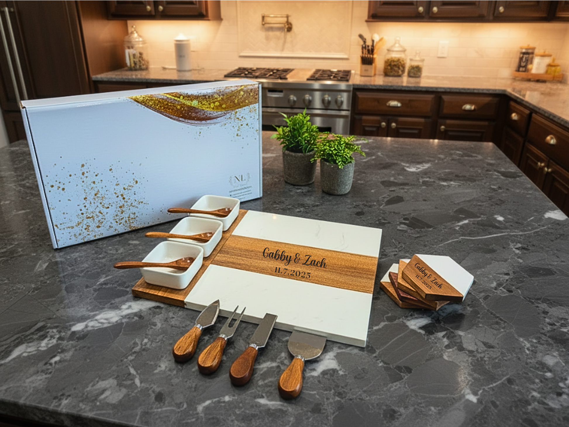 The striking contrast of warm wood and clean marble creates a luxury presentation perfect for entertaining and gifting.