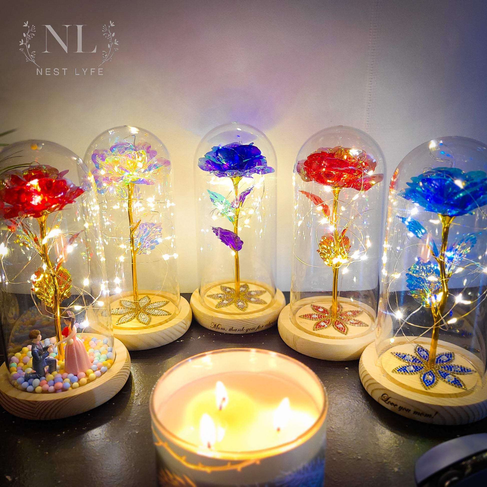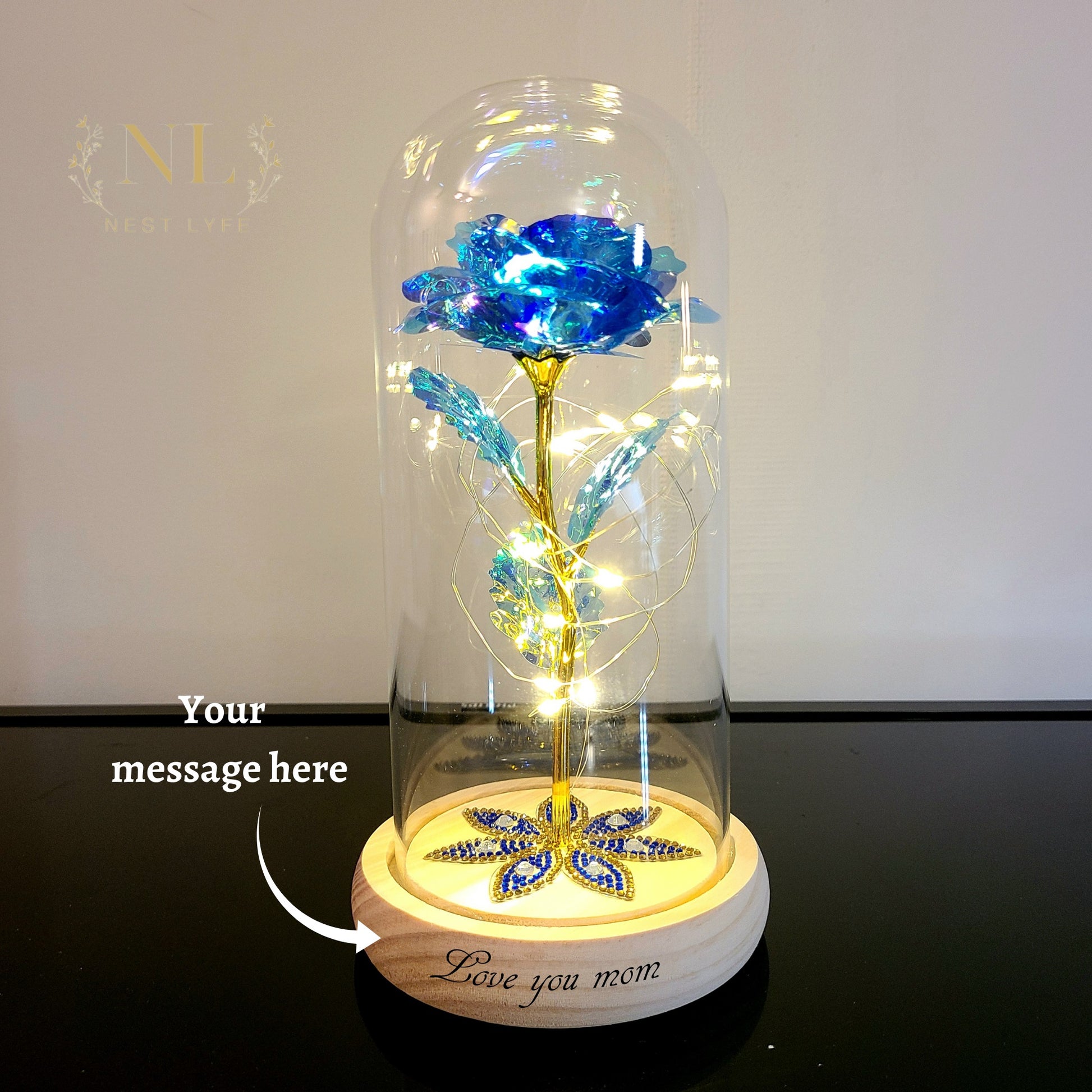 The enchanted rose perfectly and eternally represents your feelings. Express your feelings and say 'I love you' with this beautiful gold foil eternal galaxy rose encased in a high-quality borosilicate glass dome resting on a wooden base. The rose is surrounded by LED fairy light string which makes it alluring and stunning especially at night. It can be placed either at your night stand or living room, on top of your fireplace or inside the corner glass cabinet but you can rest assured that where ever it is placed, it will shine with all its majestic glow.